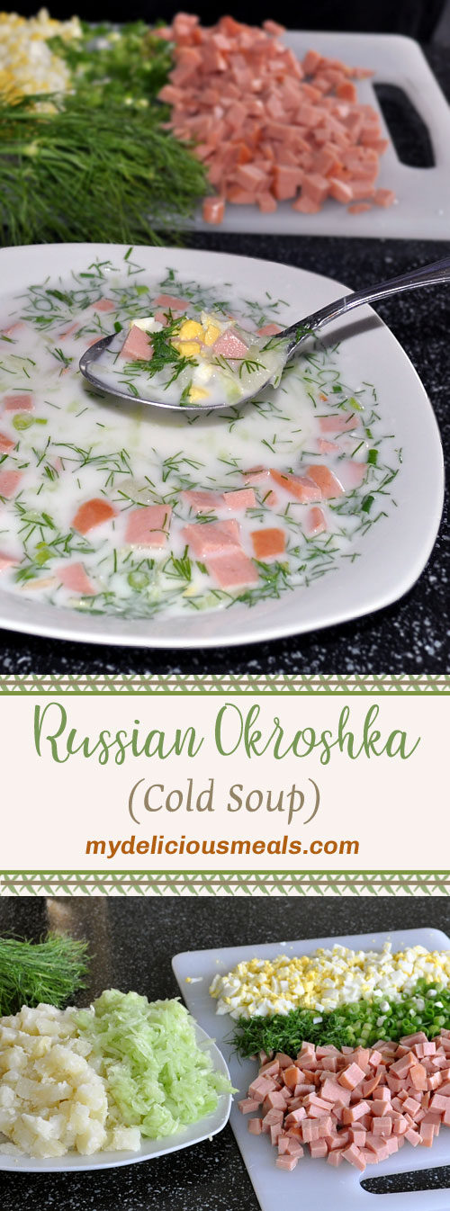 Okroshka is a cold refreshing soup of Russian origin. Originally it was made with kvass (bread drink), but later versions use diluted kefir or sour cream with vinegar. In this recipe I use diluted sour cream with some vinegar, then follow the traditional way by adding bologna, potatoes, eggs, cucumbers, dill and scallions. The soup is filling and perfect for hot summer weather.