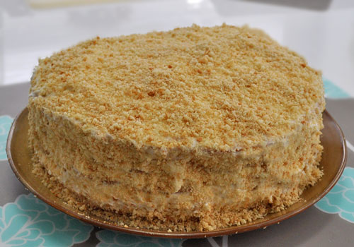 16. Посыпать торт крошками сверху и по бокам. Поставить в холодильник на 8 часов для пропитки.