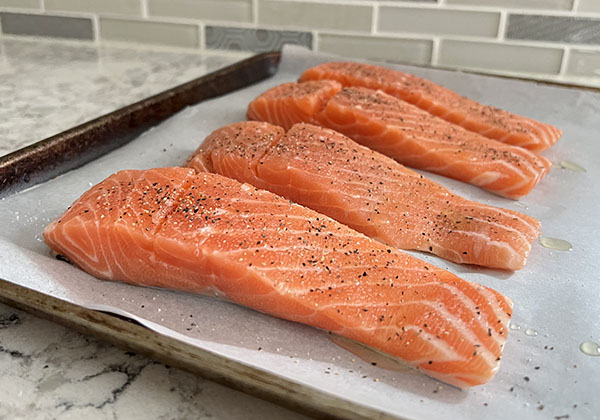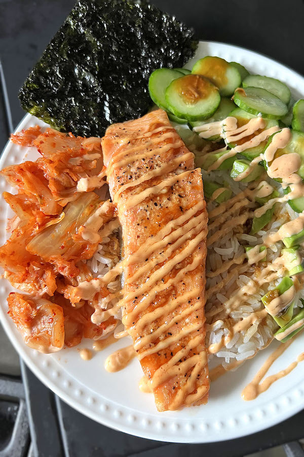 1. Preheat oven to 400F (200C). Place salmon fillets on baking sheet, season with salt and pepper, drizzle with avocado oil. 2. Bake salmon for 8-10 minutes (until the internal temperature is 140F (60C), it will later reach ~145F (63C) while resting). 3. While salmon is baking, in a small bowl combine mayo and sriracha. In a separate small bowl, combine soy sauce, rice vinegar, finely grated ginger and garlic. 4. Arrange the bowls. For each serving, place 3/4 cup cooked rice, top with salmon fillet. Add diced avocado. Arrange cucumber slices, kimchi and nori sheets on the sides. Drizzle with mayo and soy sauce mixture. Enjoy!