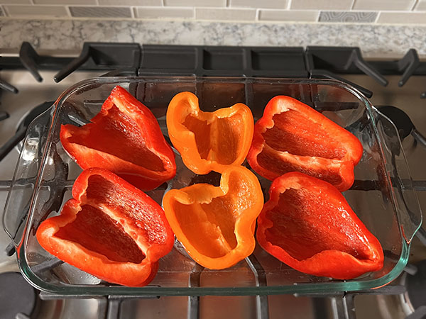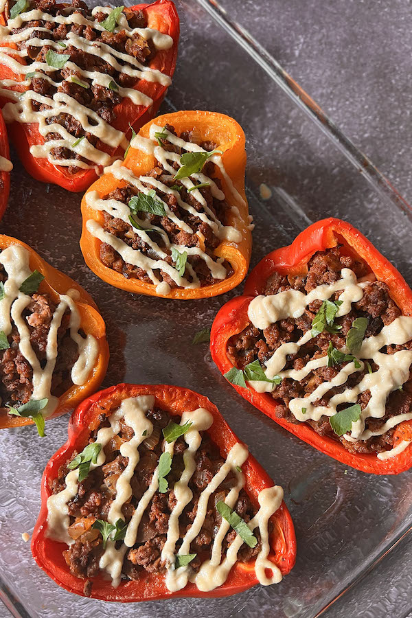 1. Preheat oven to 380F (~190C). Place pepper halves in a baking dish (cut side up), lightly season with salt, drizzle with avocado oil and bake in the preheated oven for 15 minutes. 2. Heat a large skillet over medium-high heat, add ground beef (no need to use oil) and break it up with a spatula. Move to one side of the skillet. Add chopped onion to the other side and cook until soft, for about 5-7 minutes. 3. Add chopped mushrooms, minced garlic and stir. Cook for 5 minutes. 4. Add tomato paste, water, chili powder, cumin, Italian seasoning. Season with salt and pepper. Stir and cook for another couple of minutes. 5. Remove peppers from the oven (there will be some liquid in the bottom of the peppers, no need to remove it), distribute the meat filling evenly among the pepper halves. Return to the oven and bake for 10 minutes. 6. Make the sauce. Add all the sauce ingredients to a blender jar, blend with an immersion blender until smooth. 7. Drizzle stuffed peppers with the creamy cashew sauce and serve.