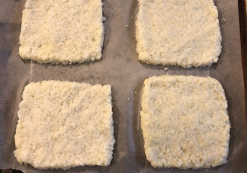 1. Разогреть духовку до 180C (350F). 2. В сковороде на среднем огне разогреть масло. Добавить рис из цветной капусты и готовить, помешивая, 5 минут. Переложить в миску. Если необходимо, слегка обсушить бумажными полотенцами. 3. К цветной капусте добавить яйцо, миндальную муку, посыпать луковым и чесночным порошком, посолить и поперчить. Хорошо перемешать. 4. Застелить противень бумагой для выпечки. Разделить смесь на 6 равных частей и руками распределить каждую часть на противне в форме квадрата (толщиной чуть тоньше сантиметра, как кусочек хлеба). 5. Запекать в разогретой духовке 10-12 минут, перевернуть и запекать еще 10-12 минут. Чтобы получить более красивую корочку, можно включить режим гриль (broil) на последние 2 минуты. 6. Дать немного остыть, потом добавить топпинги / начинку. Подавать.