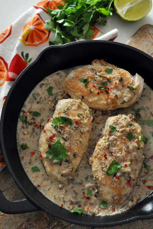1. Разогреть кокосовое масло в большой сковороде на среднем огне. Посолить курицу и обжарить по 6-8 минут с каждой стороны. Переложить на тарелку. Курица может быть не готова на этом этапе, т.к. скоро мы опять вернем ее в сковороду. 2. В ту же сковороду добавить лук и готовить 3 минуты. Добавить куриный бульон, перец, нарезанную кинзу и сок лайма. Довести до кипения и готовить 5 минут на среднем огне. 3. Добавить кокосовое молоко, довести до кипения и готовить на медленном огне еще 7 минут. Если соус необходимо сделать гуще, на этом этапе можно добавить крахмал (1 столовую ложку крахмала смешиваем с 2 столовыми ложками холодной воды, затем добавляем), довести до кипения. 4. Вернуть курицу в сковороду, накрыть крышкой и готовить на медленном огне 8-10 минут, до полной готовности. Приятного аппетита!