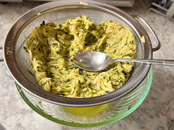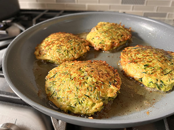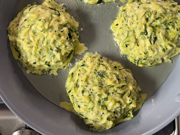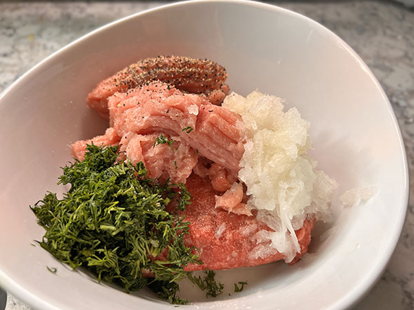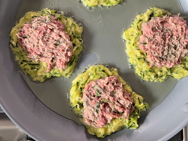 1. Shred zucchini using a box grater, season with salt and let stand for 10 minutes. 2. Add the shredded zucchini to a medium fine-mesh sieve and set it over a bowl. Use the back of a spoon to press excess liquid out of the shredded zucchini. 3. Add zucchini to a clean dry bowl, add eggs and flour, mix well. 4. In a separate bowl, combine ground meat, grated onion, chopped dill, salt and pepper. 5. Heat oil in a large skillet over medium-high heat. Drop about 1 1/2 Tablespoon of zucchini mixture into the skillet. Slightly flatten the pancake and place about 1 1/2 Tablespoon of meat mixture on the pancake (before putting meat on the pancake, you can flatten it with your hands). The filling should be spread out almost to the edges of the pancake. Drop another 1 1/2 Tablespoon of zucchini mixture on top of the meat, spread it out to completely cover the meat. Repeat with the remaining ingredients. 6. Fry approximately 5 minutes on each side, until golden brown (the thermometer inserted in the middle of the pancake should read at least 165F (74C). Serve topped with sour cream.